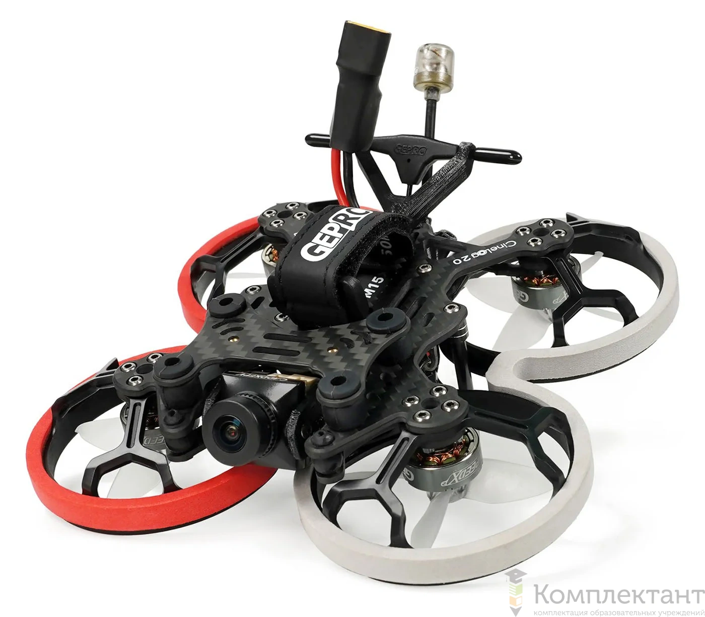 В основе комплекта — компактный квадрокоптер формата CineWhoop с защищённой рамой, что делает полёты безопасными и позволяет тренироваться даже в ограниченных пространствах. Квадрокоптер дополняется аппаратурой дистанционного управления, очками для полётов от первого лица, аккумуляторами с зарядным устройством и набором переходников. Важной частью является FPV-камера с записью в высоком разрешении и встроенной стабилизацией изображения, что открывает широкие возможности для творческих и учебных проектов.