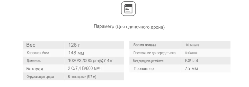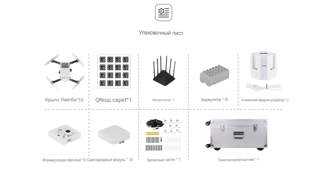 Комплектация Набор дронов -10  шт STEM / Зарядное устройство для литиевых батарей х 10 / Коврик с QR-кодами х 1 / Маршрутизатор х 1 / Литиевая батарея х 16 / Модуль позиционирования х 10 / Фонари х 10 / Соединительный кабель х 10 / Зарядная база х 10 / Кабель микро-USB х 10 / Ключ для пропеллеров х 1 / Инструкция х 1 / Кейс транспортировочный х 1 / Запасные винты (по часовой стрелке / против часовой стрелки по 2 шт.) х 10 / Запасные моторы (по часовой стрелке / против часовой стрелки по 2 штуки) х 8 / Запасные штифты (стандарт: 100 | половина: 10) х 4 / Руководство