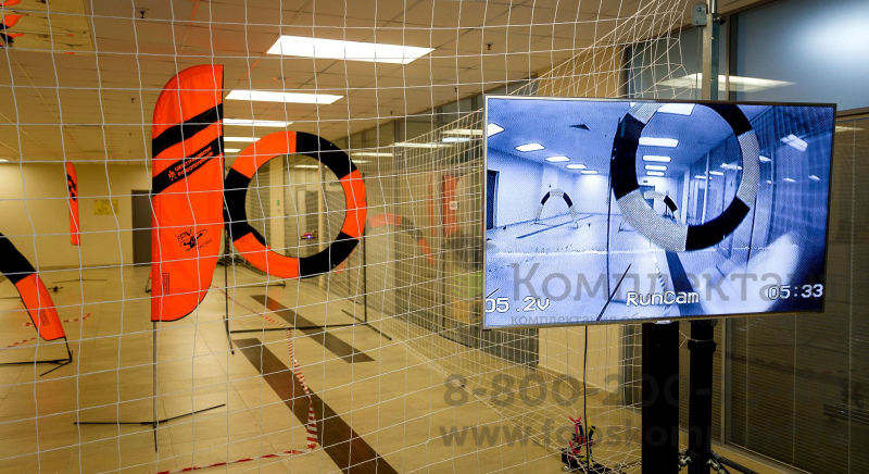 Трасса для проведения соревнований по дрон-рейсингу, включающая в себя поворотные флаги, курсовые ворота, площадку для взлета-посадки, подвесные кольца