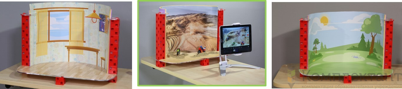 Особенностью мультлаборатории является возможность трансформировать съемочную площадку под творческие задачи оператора. Это достигается использованием в качестве строительного материала пластиковых кубиков со специальным креплением, входящих во множество наборов, выпускаемых нашей компанией. Данное решение допускает широкое применение элементов набора Академия Наураши «Курс логики базовый» (30 элементов) или набора Академия Наураши «Курс логики базовый» (60 элементов) для создания подвижных платформ. Такие технологии существенно расширяют возможности реализации эффектов движения в кадре.