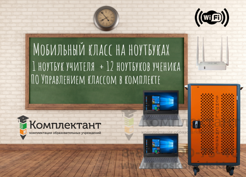 В состав мобильного класса входят: 12 ноутбуков учеников + 1 ноутбук учителя, ПО для управления классом с компьютера учителя, сейф-тележка с возможностью подзарядки ноутбуков, встроенной высокоскоростной точкой доступа Wifi частотой 2.4/5ГГц , антивирусная защита и встроенный контроль посещаемых web ресурсов позволит надежно защитить учеников от нежелательной информации.