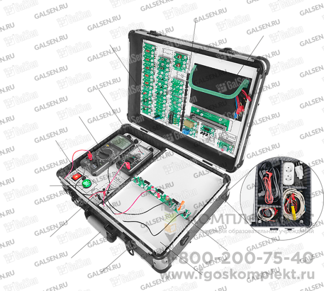 Типовой комплект поставки модульного учебного лабораторного стенда ГалСен® ШК1-ТЭЭА-П-Р включает в себя оригинальные сменные функциональные блоки зарегистрированного товарного знака ГалСен® и иные компоненты, перечень и описание которых предоставляется по запросу.