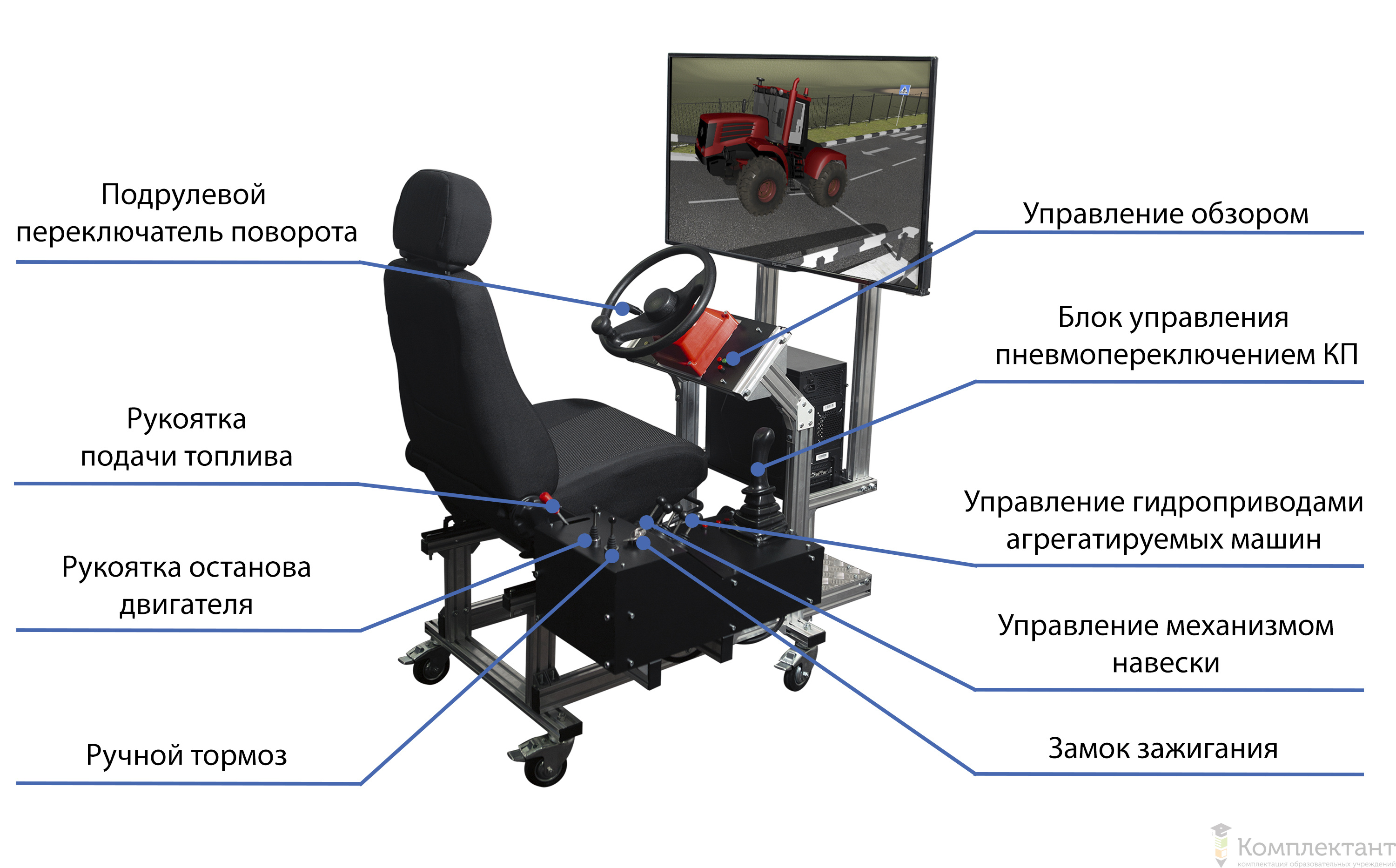 В комплект учебного тренажера входит компьютерная программа Simgenix Tractor Pro 2024, содержащая набор учебных упражнений по принципу "от простого к сложному" и предназначенная для тренировки навыков управления. Детально смоделированные виртуальные рабочие и учебные площадки, а так же точная модель трактора позволяют проводить эффективное обучение по профессии. Программа позволяет тренировать навыки управления двумя типами тракторов: МТЗ и К-744.