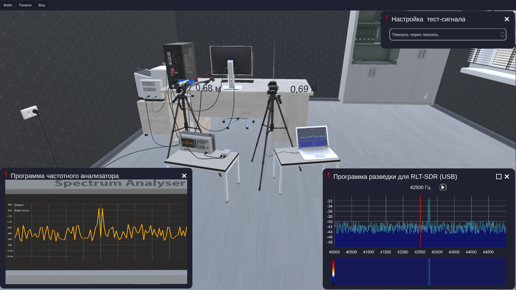Виртуальный тренажёр состоит из рабочего места с СВТ (монитор, VGA-разъем), телескопической и дипольной антенн (ТСР) и генератора электромагнитного излучения. Тренажёр дает представление о монтаже и вариантах расположения телескопической и дипольной антенн при перехвате информативного сигнала. Тренажёр предназначен для имитации излучаемого тест-сигнал от СВТ и отображения результата его обнаружения в частотном диапазоне при наличии всплесков и спадов по энергетической составляющей через анализатор спектра. В тренажёре для оценки защищенности СВТ во время использования генератора электромагнитных помех используется анализатор спектра, представленный в двух вариантах: программное обеспечение на ноутбук для телескопической антенны и самостоятельное устройство для дипольной антенны.