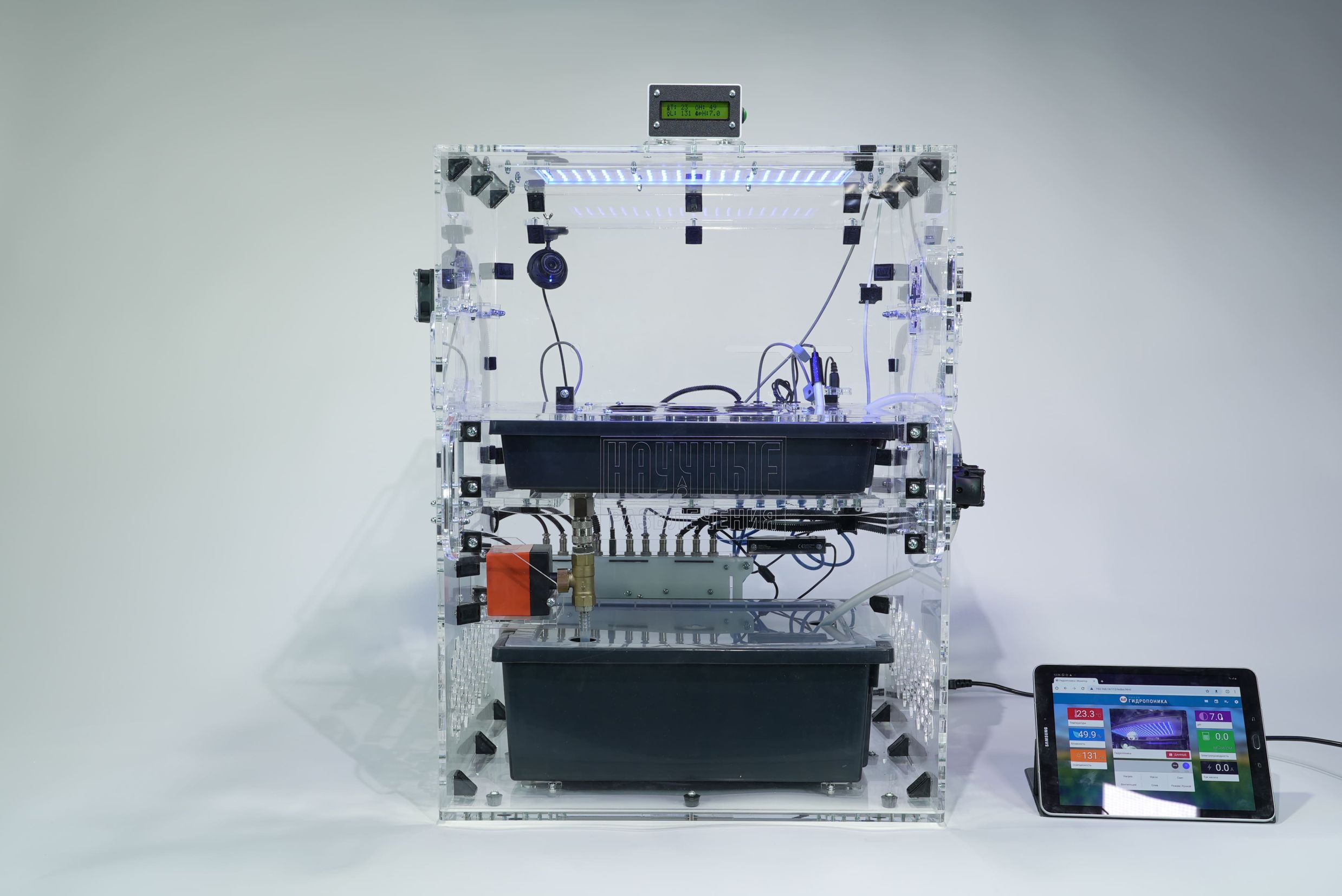 Установка гидропонная представляет собой модель в виде настольного стенда с внутренним отсеком, на корпусе которого смонтированы все элементы устройства, входящие в её гидравлическую и электрическую схемы.