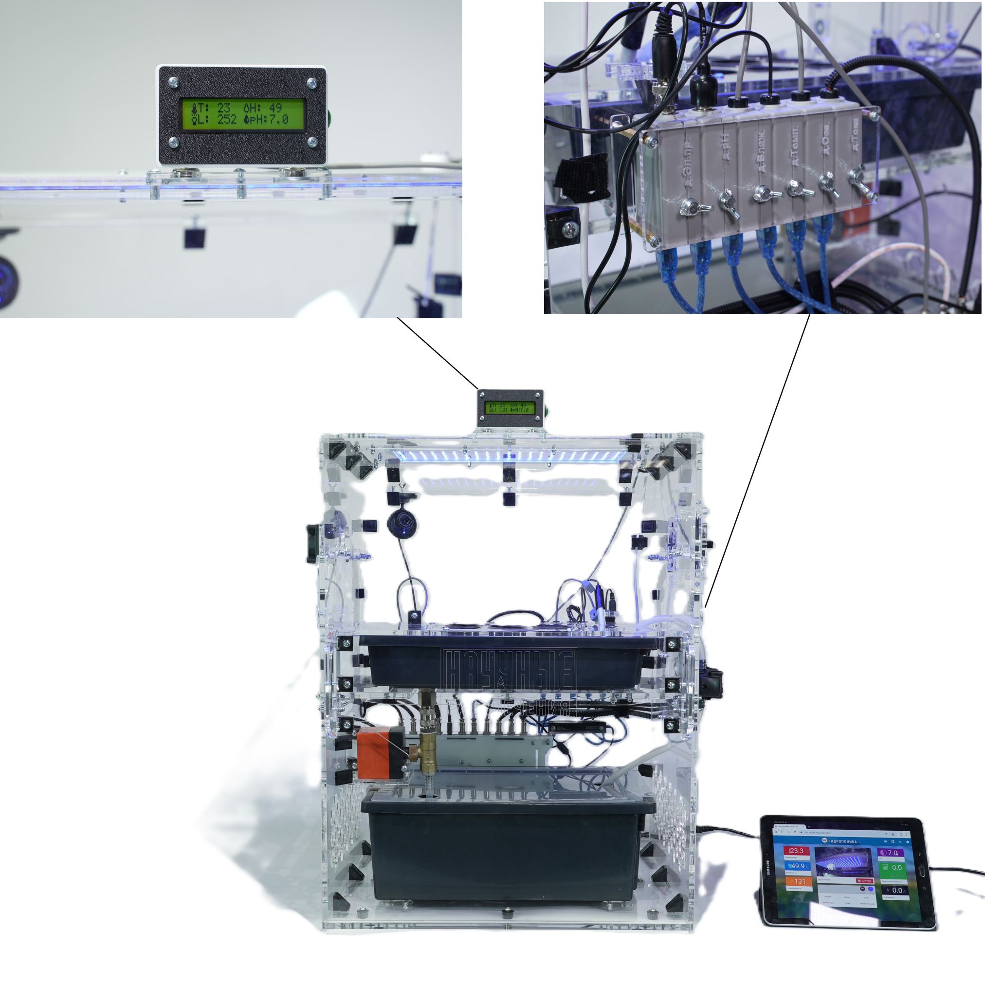Управление всеми режимами работы и мониторинг за показаниями датчиков установки гидропонной осуществляются через локальный веб-интерфейс, который становится доступным при проводном или беспроводном подключении микрокомпьютера к локальной сети.