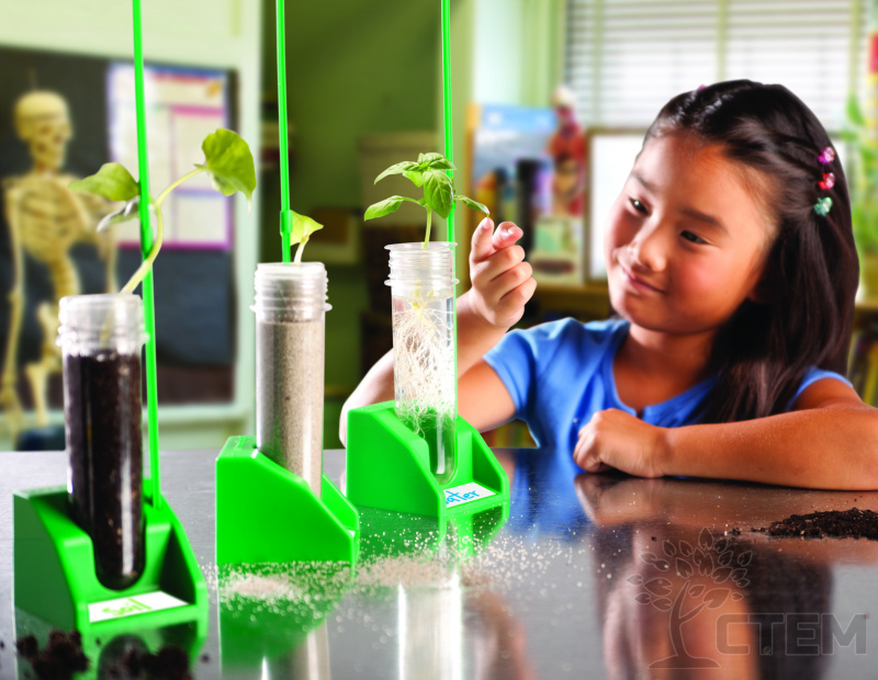 Ребенок наблюдает, как в небьющихся пробирках с водой растут корни растений.