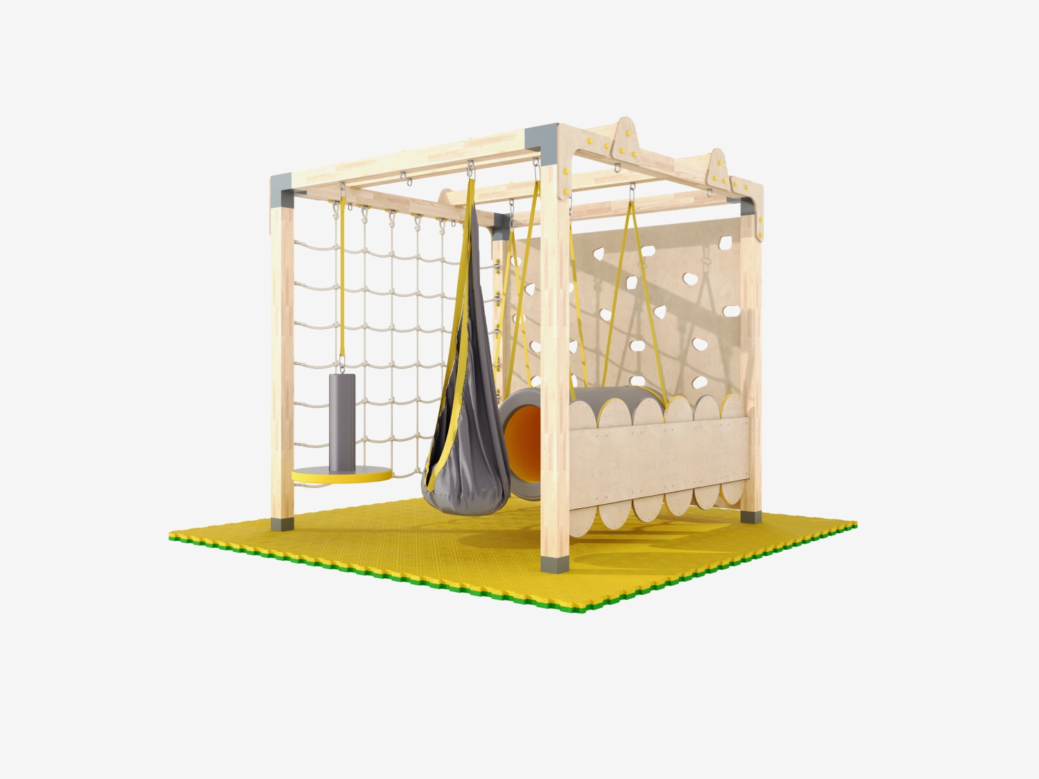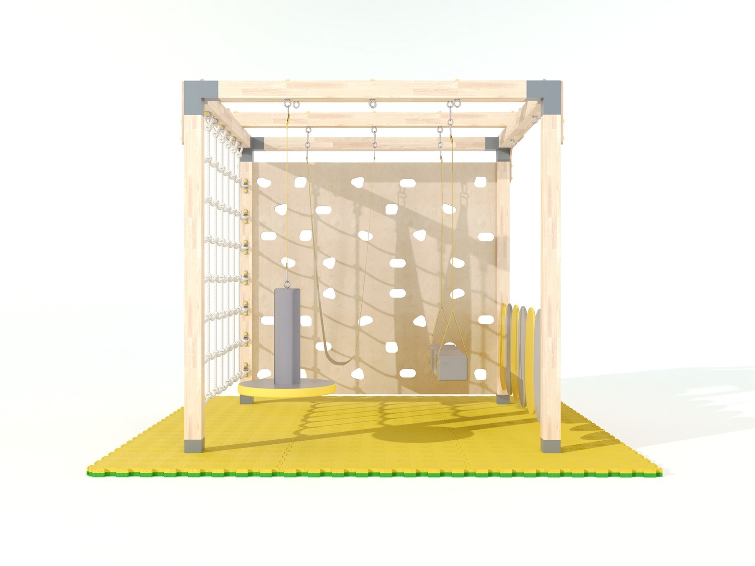 Спортивный комплекс представляет собой стационарную раму из бруса с комплектом навесного оборудования для решения разных моторных и сенсорных задач.