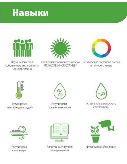 • Программирование необходимых параметров света, температуры, влажности, ветра, капельного полива в каждой микроклиматической зоне, создание и проведение отдельных проектов экспериментов путем создания цифровых программ в количестве не менее 40 одновременно.
