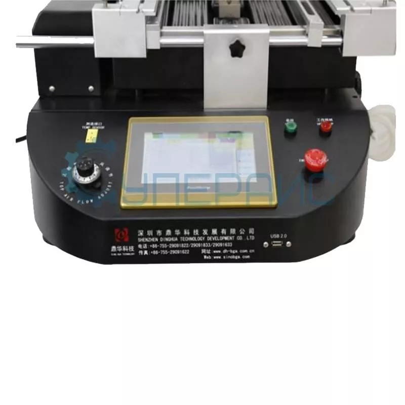 Цифровая паяльная станция Dinghua с потребляемой мощностью до 4800 Ватт. Минимальный размер BGA чипов составляет 2 миллиметра, а максимальный – 80 миллиметров. Оба нагревателя термовоздушные (верхний и нижний), сам преднагреватель имеет инфракрасный элемент нагревателя.