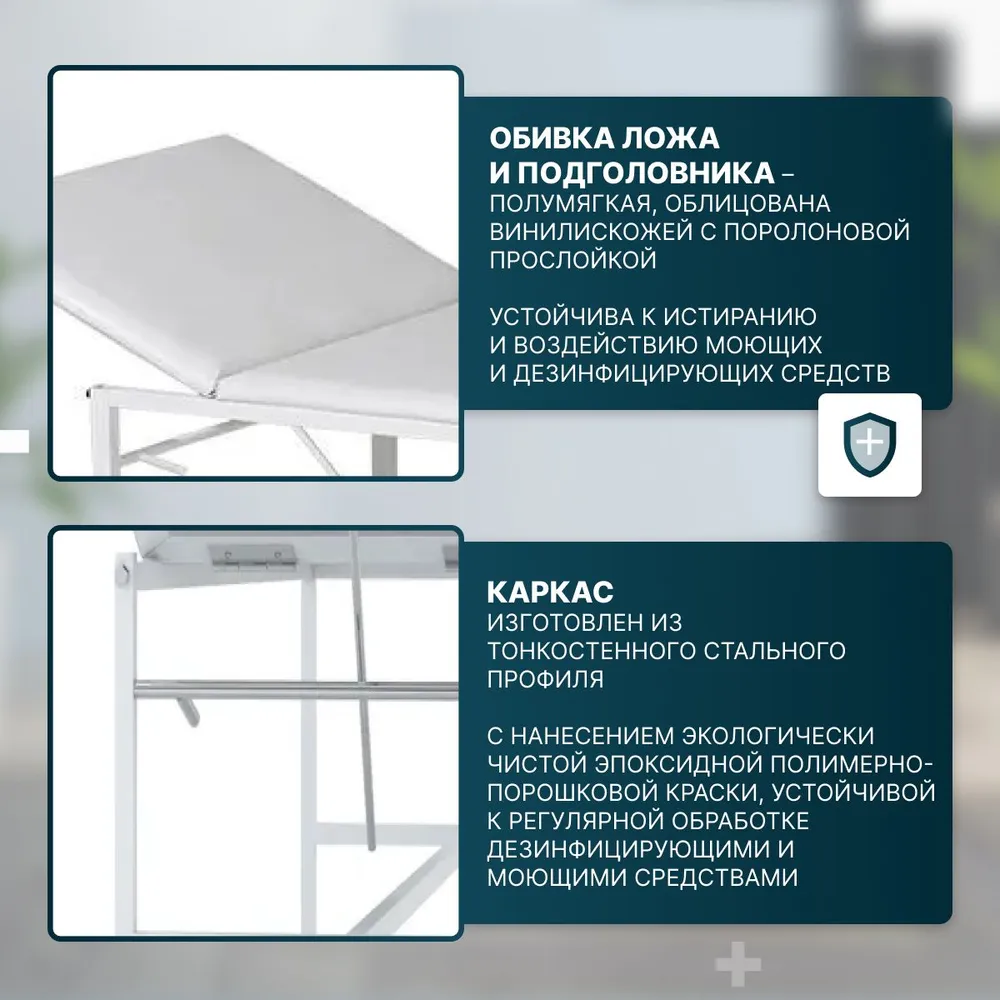 Смотровая кушетка имеет современную обивку, которая лёгкая в чистке и не требует сложного ухода.