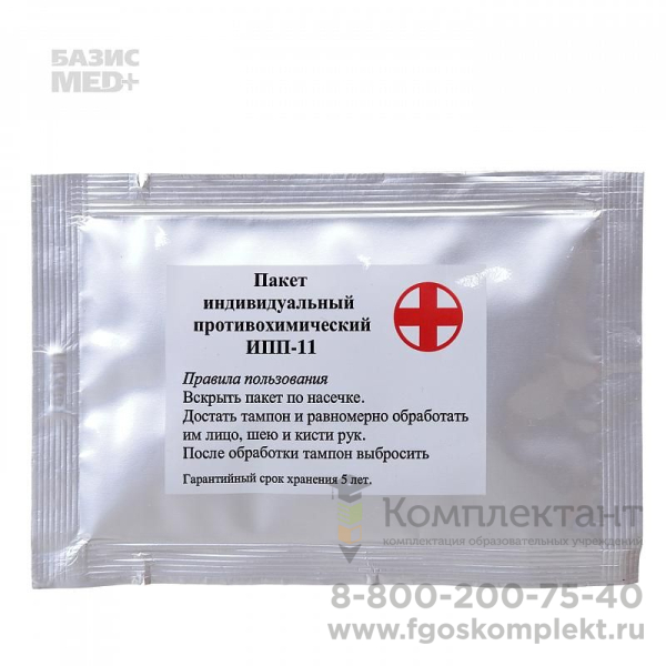 Пакет ИПП-11 являет собой герметичный пакет, содержащий тампон, выполненный из нетканых материалов и пропитанный противохимическими средствами.