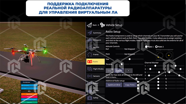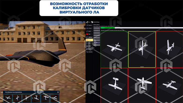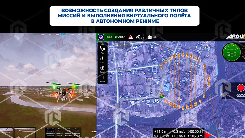Виртуальный учебный комплекс «Отработка навыков составления полетного задания для бпла различных типов» - позволяет произвести изучение принципа работы с программным обеспечением наземной станции контроля беспилотным ЛА для планирования и составления полетного задания и управления БПЛА, весь интерфейс ПО и принцип работы достоверно имитирует распространенное программное обеспечение НСУ на базе QGC и позволяет произвести имитацию работы с ПО в режимах составления полетного задания, подготовки и симуляционной отработки различных типов миссий. Данный тренажер предлагает различные режимы работы, которые позволяют пользователям практиковать составление полетных заданий в разных условиях и сценариях. Он включает в себя такие функции, как выбор точек маршрута, определение радиуса действия, установка ограничений и параметров полетной миссии, анализ метеоусловий и многое другое. Комплекс также включает в себя программный симулятор полёта с системой визуализации процесса полета на основе показателей датчиков виртуального БПЛА, трехмерное окна симуляции может транслироваться на внешний широкоформатный дисплей для наблюдения за ходом симуляции.