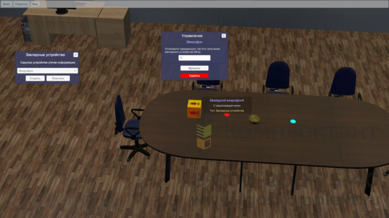 Программный модуль “Конструктор” предназначен для преподавателя. Содержит: интерфейс и средства моделирования прямоугольной комнаты с проёмами под окна и двери; наполнение комнаты объектами и предметами интерьера; размещение закладных устройств и скрытых видеокамер на различные поверхности; возможность тестирования собственной работы в режиме отладки.