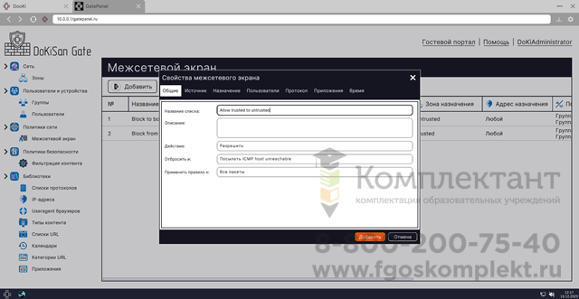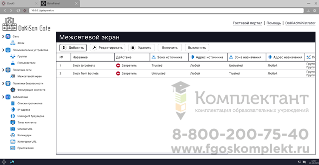 - блокировка сайтов в соответствии с заданными политиками сети и безопасности МЭ;