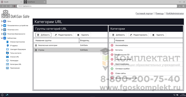 - создание и изменение списков категорий URL, для разбиения списков URL-адресов на группы категорий и упрощения построения политик сети и безопасности. В рамках базовой конфигурации заданы группы безопасных категорий и угроз;