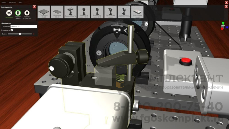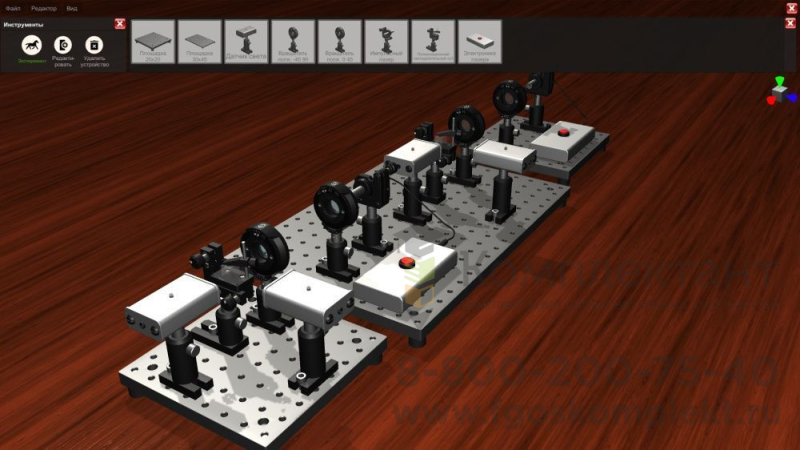 В режиме редактирования происходит сборка оптической системы из компонентов путем перетаскивания компонентов из списка каталога на рабочий стол или сборочную плату. Также существует возможность настройки параметров компонентов.