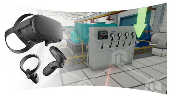 Реализовано интерактивное взаимодействие с элементами трехмерных моделей с помощью шлема и контроллеров виртуальной реальности Oculus Quest, с возможностью перемещения в открытых виртуальных пространствах, масштабированием трехмерных моделей нефтегазового оборудования.