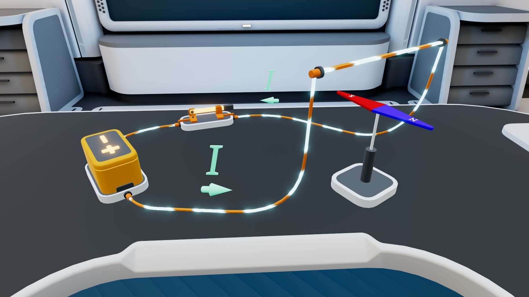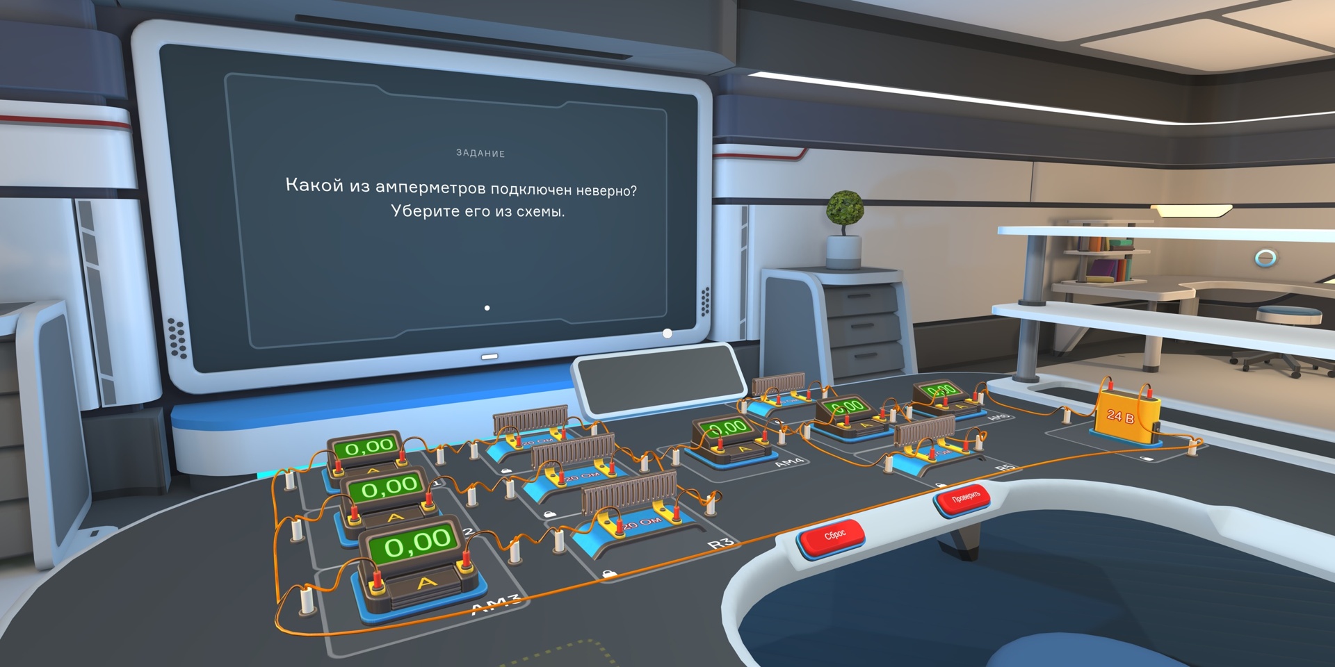 просмотреть или пропустить. После инструкций по управлению на экране появляется описание задачи, связанной с работой электрической цепи на виртуальном столе в сцене.