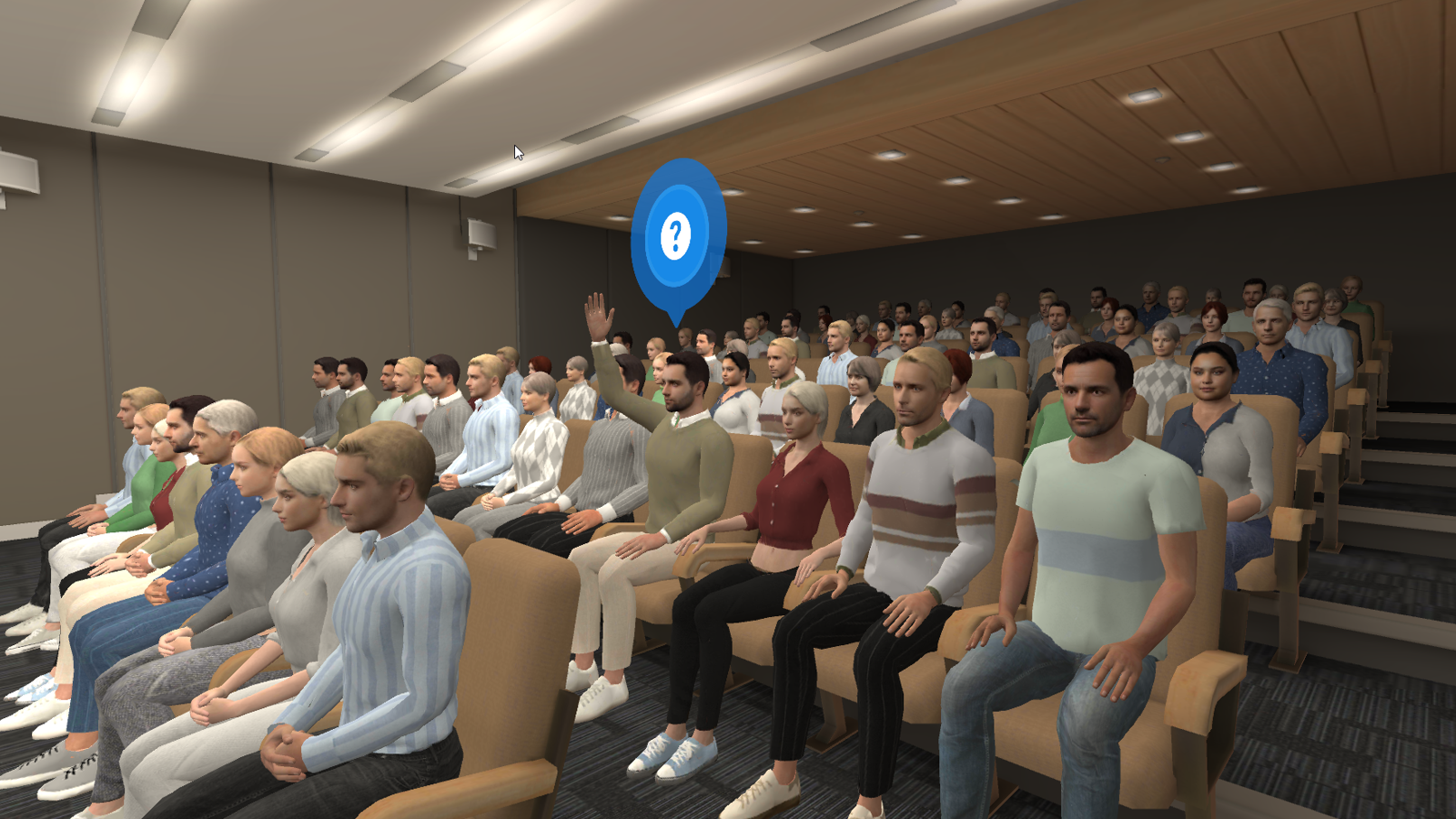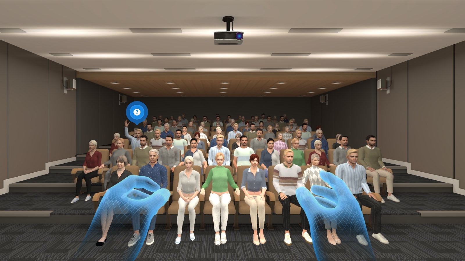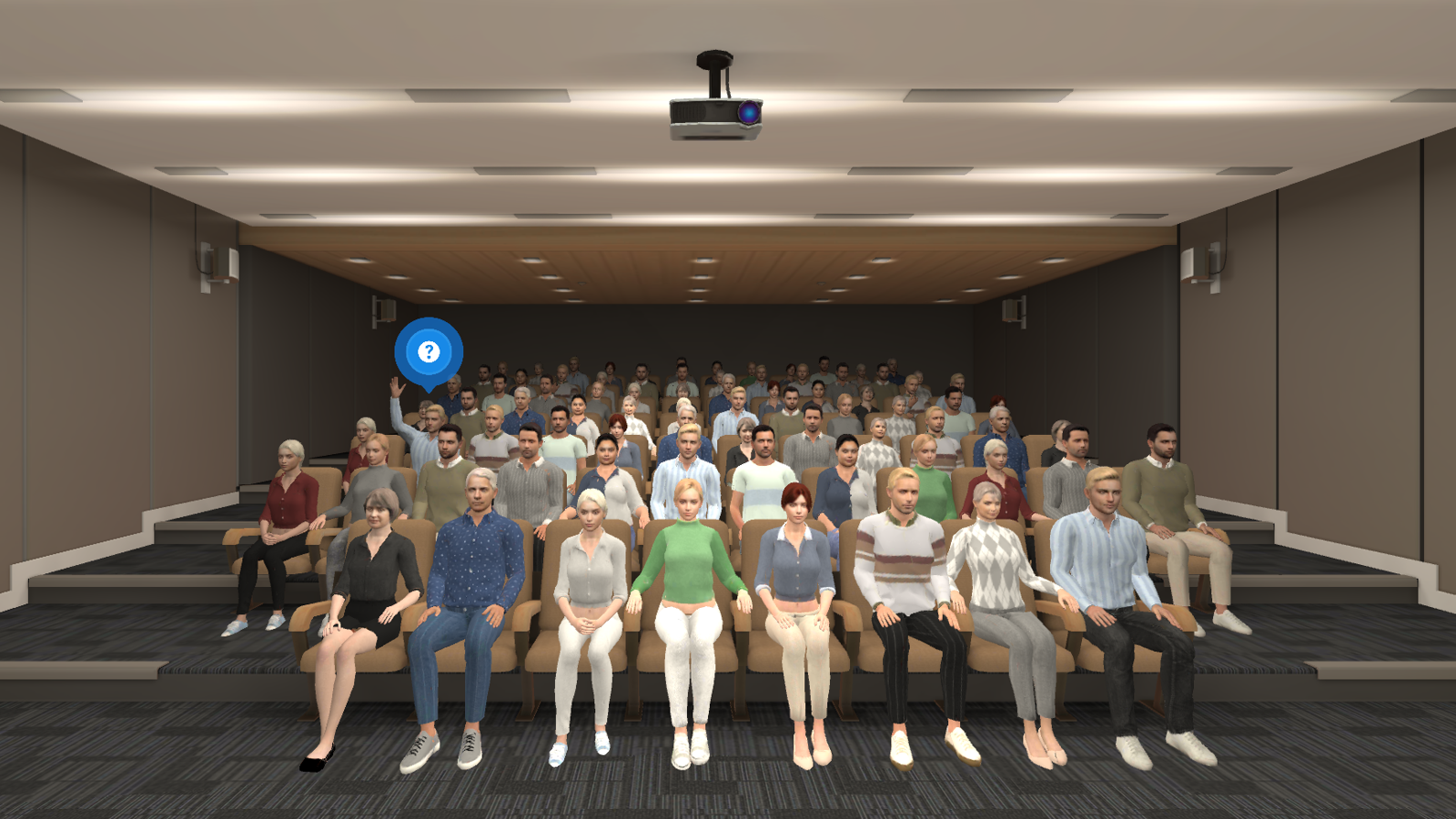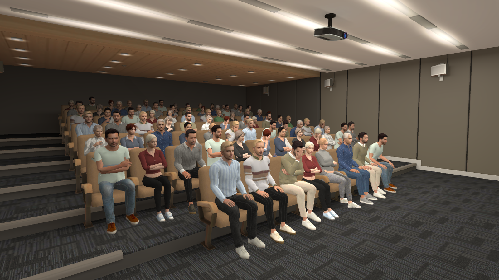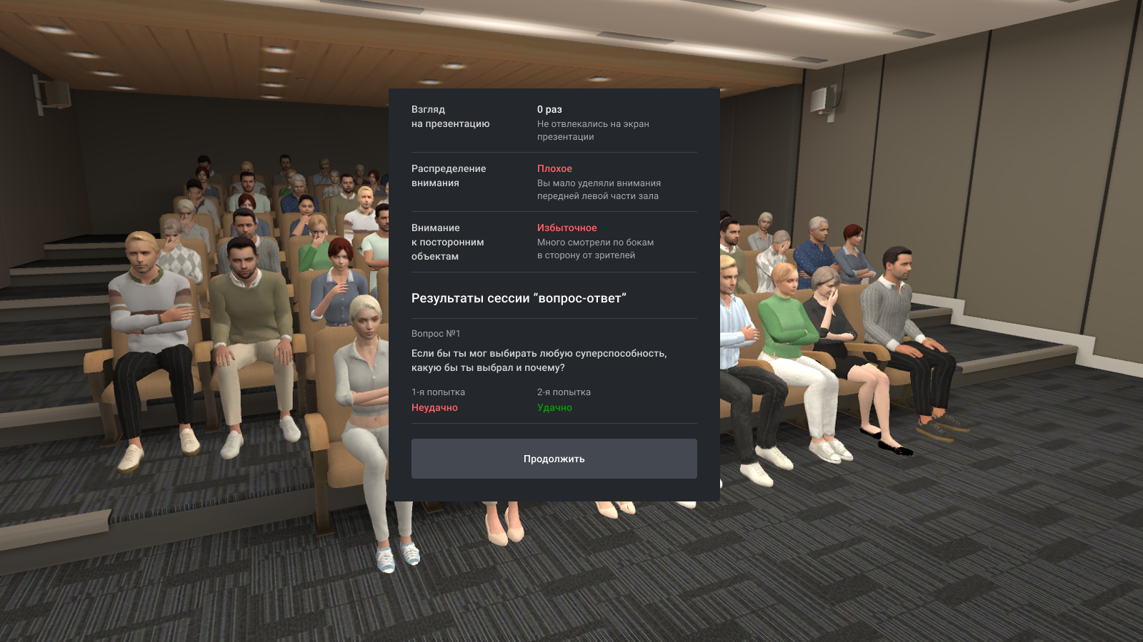 Тренажёр “Публичные выступления” в виртуальной реальности с системой анализа речи и жестикуляции позволяет приобрести и развить навык общения с публикой.